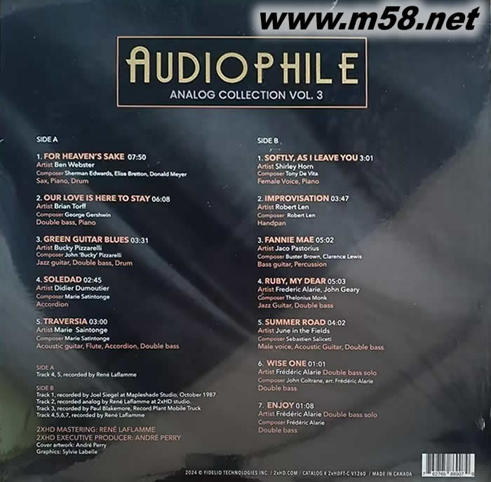 模擬天碟第三號 Audiophile Analog Collection Vol.3 南瓜第3集 黑膠(m58.net) 類比靚錄音加精彩多元化選曲,就是今次(模擬天碟第三號)黑膠唱片的主要賣點。 Pure and Simple ~ 清純!傳遞出錄音環境真面貌,帶出現場真音樂感受。 廣受好評的發燒系列,模擬天碟黑膠唱片第三號,收錄了Ben Webster、Jaco Pastorius 和 Bucky Pizzarelli 等爵士樂傳奇人物的曲目,以及2xHD自家錄制的8首發燒作品,涵蓋了爵士、古典、即興演奏等等,一如既往,完美打造了這卓越發燒專集。