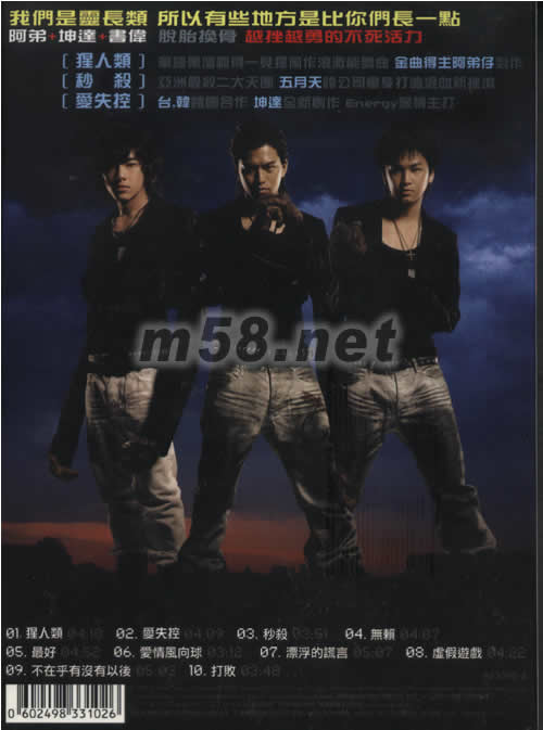 猩猩→人類→猩人類 物競天擇 適者生存→混血新品種 New Energy 音樂新進化 新能量來自猩人類 五月天+阿弟仔+周傳雄等音樂精英聯手開發10首混血激音新品種 我們是靈長類 所以有些地方是比你們長一點 阿弟+坤達+書偉 脫胎換骨 越挫越勇的不死活力 [猩人類] 華語樂壇難得一見猩風坐浪激能舞曲 金曲的主阿弟仔制作 [秒殺] 亞洲最殺二大天團 五月天跨公司量身打造混血新搖滾 [愛失控] 臺,韓跨國合作 坤達全新制作 Energy深情主打