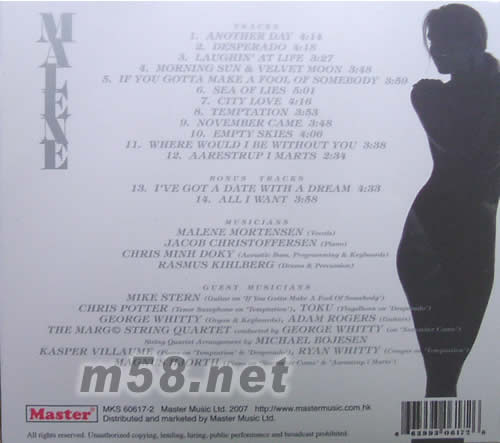 MALENE 絲絨月亮 DESPERADO 艷影濃情(頂級發燒女聲專輯)(m58.net) 丹麥著名靚聲女歌手MALENE MORTENSEN演繹多首名曲及創作作品.鋼琴引子帶出主題曲DESPERADO,濃情密意刻骨銘心.通透靚絕的音色, 人聲圓潤立體,BLUE NOTE皇牌子CHRIS MINLS DOKY監制.