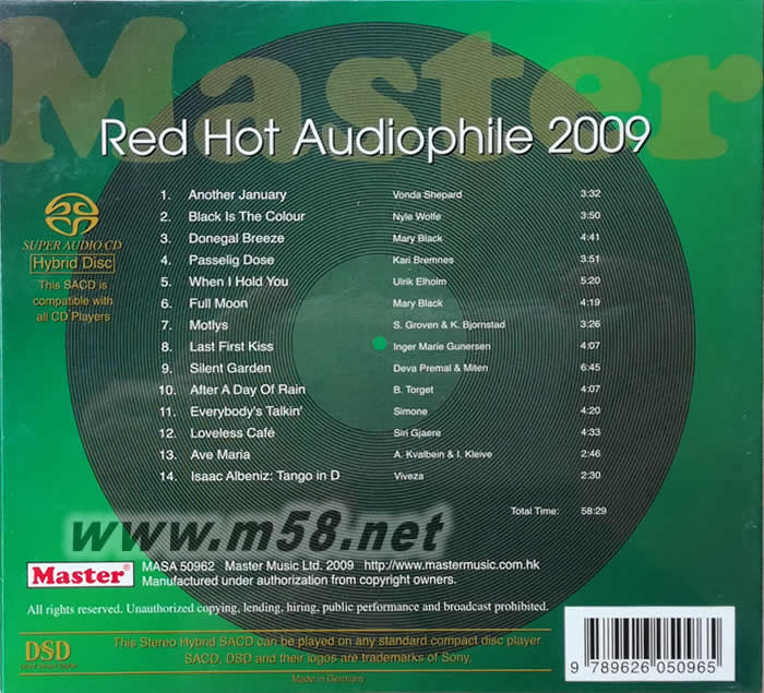 明達(dá)超級(jí)發(fā)燒碟 Red Hot Audiophile 2009 SACD(m58.net) 繼去年的「紅色發(fā)燒碟2008」熱賣后,香港Master Music再度推出2009年的精選集「綠色發(fā)燒碟」。與上張選輯相同,仍然選擇了旗下代理音樂(lè)中的佼佼者,讓樂(lè)迷們可以買一張專輯聽到許多好音樂(lè)。打頭陣的是Vonda Shepard的「Another January」。 這位以往常出現(xiàn)在美國(guó)影集「愛莉的異想世界」中演唱而走紅的歌手2008年專輯由名製作人Mitchell Froom(曾製作蘇珊薇格等人專輯)操刀,富有穿透力的唱腔一如往常,而慢板搖滾曲調(diào)讓人低迴不已。「Black Is The Colour」這首著名美國(guó)民謠則是由愛爾蘭男中音Nyle Wolfe溫柔的歌聲演唱,配上較為激昂的節(jié)奏,別有一番風(fēng)味。 老牌愛爾蘭歌手職業(yè)Mary Black演唱生涯已經(jīng)超過(guò)二十五年,這里選錄的兩首歌曲分別來(lái)自她1996年的專輯「Circus」與2005年的「Full Tide」,可以聽到十年前后這位女星唱腔的差異。同樣有歌后地位的則有挪威的Kari Bremne,個(gè)人第十三張專輯「LY」的「Passelig Dose」照樣有著強(qiáng)烈的節(jié)奏與溫暖的歌聲,背景和聲的男聲更增添了歌曲的和諧感。 本專輯還有不少挪威音樂(lè)人的貢獻(xiàn):挪威口琴名家Sigmund Groven則在唱片名廠KKV推出的現(xiàn)場(chǎng)演奏會(huì)唱片中吹奏了他在1979年時(shí)的著名作品「Motlys」,伴奏的不是別人,正是另外一位挪威著名鋼琴詩(shī)人Ketil Bjornstad!這段演奏讓空氣中充滿了美麗的殘響,聽完久久不能忘懷。挪威女歌手Siri Gjaere的「Loveless Café」是一首清新的搖滾作品,讓樂(lè)迷們體會(huì)北歐搖滾的不同熱情。丹麥男歌手Ulrik Elholm以充滿年輕氣息的爵士樂(lè)演唱「When I Hold You」,溫暖飽滿的歌聲配合清新的錄音氣氛,非常符合這首歌曲的浪漫情境。 心靈音樂(lè)知名二人組Deva Premal & Miten的「Silent Garden」以清新脫俗的空靈氣氛配合溫暖的歌聲與和聲,讓樂(lè)迷們體會(huì)心靈音樂(lè)的神秘療癒力量。奧地利的年輕女歌手Simone在日本Venus唱片公司推出的第四張專輯「Let’s Fall In Love」一樣在紐約錄製,這首「Everybody’s Talkin’」維持Venus一貫的高品質(zhì)錄音與用心製作,讓人感受到爵士歌曲單純的美好。 此精選輯以兩首美麗的演奏曲收尾:「Ave Maria」是鋼琴與大提琴的美麗合奏,而阿爾班尼士的「D大調(diào)探戈」則以室內(nèi)樂(lè)的編制演出這曲動(dòng)人的探戈小品。各種樂(lè)風(fēng)、來(lái)自各個(gè)國(guó)家的不同音樂(lè)的唯一共通點(diǎn)就是:它們都能讓樂(lè)迷的生活更為美好!