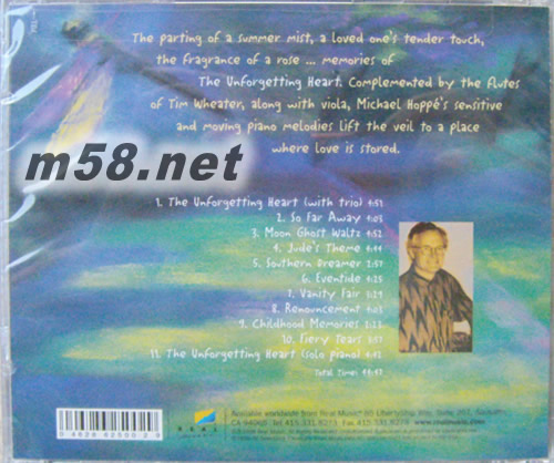 Michael Hoppe -The Unforgetting Heart烙印(m58.net) 這一張有如夏日薄霧般迷離的新世紀音樂,制作人麥克.霍普。如同題目《刻骨銘心》,一系列的歌曲創作靈感起源于一些愛及感人的音樂故事。 本專輯由這些優美感人的小品組合而成,以充滿綿綿愛意的笛和鍵盤樂器、中提琴為主軸發展而成11首音樂,仿佛連空氣都盈了玫瑰花香。 本專輯是是Michael Hoppe的作品。專輯里的十一首樂曲都以Micheal的鋼琴做主旋律。他的彈法特別自然流暢,他的手指對琴鍵有敏銳的觸覺,鋼琴在他的細敲慢彈下,華麗的旋律如玫瑰花的幽香,穿過情人薄薄神秘的面紗。笛哨聲不時在音樂中出現,心靈之窗在笛聲的敲擊下慢慢打開,提琴聲音在需要時立即出現。鋼琴的演奏和錄音都達到真實的最佳效果,琴聲有豐富的表現力和最好的聽感。 Michael Hoppe的作品,永遠是那么的充滿情感和柔情,引發了我們多少的情緒和感慨。無法用更多的詞匯去描述作品的感覺,因為音樂永遠是墜落在我們的心中,激蕩起內心的水花,卻無法給別人看到。