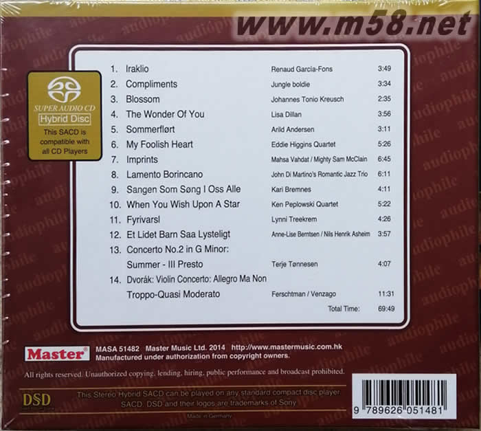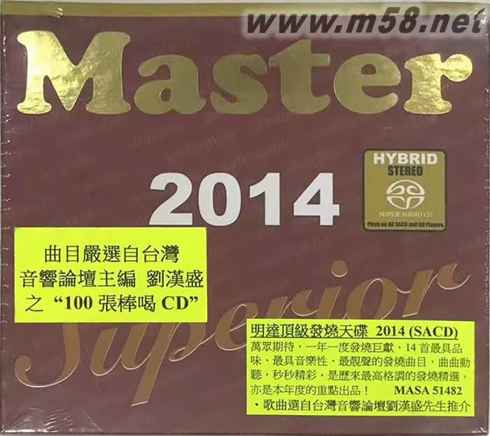 明達頂級發燒精選 MASTER SUPERIOR 2014 SACD 劉漢盛推介(m58.net) Master一年一度巨獻,旗下代理唱片十四首包含古典、流行、爵士、探戈、新世紀音樂、藍調等不同樂風的精選,是音響迷每年必收藏的超級唱片! 香港明達音樂(Master Music)旗下代理的日本Venus Jazz、 Northstar Recordings、Challenge Classics、Enji、荷蘭Turtle、挪威民謠大廠KKV與古典大廠挪威Simax等歐陸知名發燒唱片品牌,堪稱亞洲最具發燒精神的唱片代理商。他們每一年精選旗下所代理的唱片,推出之精選集-「Master Superior系列」更是音響迷每年必收藏的超級唱片。 2014年,明達音樂參考「音響論壇」總編輯劉漢盛先生濃縮六十年音響生涯、精心撰寫之「音響調聲學」中提出的「嚴選100張棒喝CD」,將旗下代理之「棒喝CD」集合成「緋色發燒碟」。 第一軌由低音提琴大師Renaud Garcia-Fons演奏的「地中海留情」與第二軌Jungle Boldie的「發燒極品」,應該早就是音響迷人手一張的頂級發燒錄音,想考驗音響系統,用這兩軌準沒錯!專輯里面當然也少不了日本爵士大廠Venus Records 艾迪希金斯的「My Foolish Heart」(VHCD-2013)、約翰.迪.馬替農浪漫三重奏「Lamento Borincano」 (TKCV-35345)、肯.皮普洛斯基四重奏「When You Wish Upon A Star」(TKCV-35406) 。專輯也收錄重唱貓王經典歌曲的Lisa Dillan「Love Me Tender」、伊朗女歌手Mahsa Vahdat 與美國藍調歌手Mighty Sam McClain 跨界合作的「真愛共融」,有「玫瑰仙子」之稱的挪威天后Kari Bremnes 的經典之作「Svarta Bjorn」、以及早已列入經典發燒盤的「牧羊女」與管風琴名盤「圣潔美聲」。專輯最后以Simax的「爆棚四季」與荷蘭超級錄音師Bert van der Wolf精心錄製的德弗札克「小提琴協奏曲」收尾,絕對是今年最發燒的超級精選!