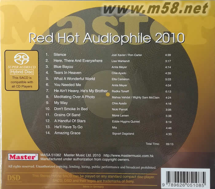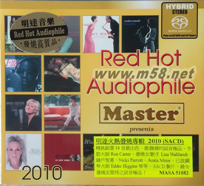 明達火熱發燒精選 Red Hot Audiophile 2010 SACD(m58.net) 《紅色發燒碟之2010》是明達唱片于2010年推出的一款最新發燒錄音,精選收錄14首歌曲,從搖滾、爵士到抒情、古典,從獨唱、重唱到合唱,曲曲發燒,歌聲氣韻動人,弦樂華美絕倫,不容錯過。 對于音響迷來說,一張能夠盡顯聲音美感與音響性極致的唱片,往往是可遇而不可求的。面對市面上琳瑯滿目的發燒唱片專輯時,那種不確定的心態真只能用又期待又怕受傷害來形容。這時候,由音響名家挑選的音效示范唱片,就是最佳的選購對象了。繼去年的《紅色發燒碟之2009》熱賣后,香港明達唱片再度推出2010年的精選集《紅色發燒碟之2010》。與上張選輯相同,仍然選擇了旗下代理音樂中的佼佼者,讓樂迷們可以買一張專輯聽到許多好音樂。