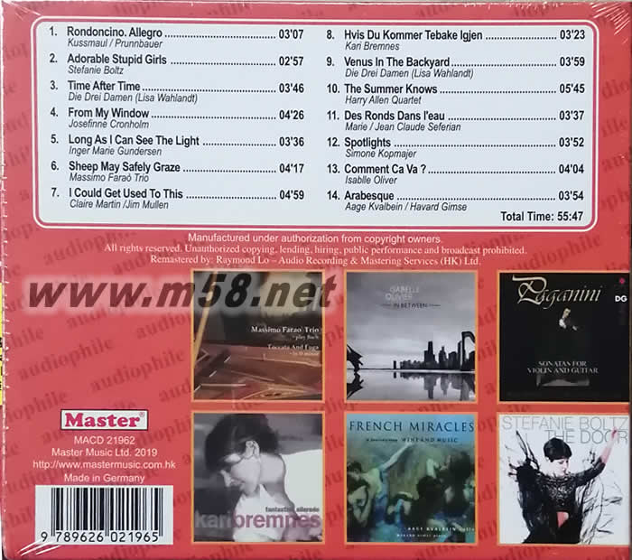 明達頂級發燒精選 MASTER SUPERIOR 2019 CD(m58.net) 每一年的《Master發燒碟》會受到音響迷期待不是沒有道理,除了精湛的選曲之外,母帶后製的用心也是有目共睹的?!禡aster發燒碟2019》更破天荒送到德國壓製,誓言帶給發燒友最極致的聽覺享受!專輯以大家熟悉的「弦燒樂韻」小提琴與吉他合奏的美樂開頭,接著是從爵士樂團Le Bang Bang女主唱史帝芬妮.博茲(Stefanie Boltz)的新專輯《The Door》選出的「可愛的傻女孩」,清亮的吉他搭配絕美的女聲,引您進入迷人又動聽的音響新境界。風情萬種的爵士女伶麗莎.華蘭德(Lisa Wahlandt)這次與鋼琴手Andrea Hermenau合組Die Drei Damen演繹流行金典,獲選的是第3首「一次又一次」與第9首「后院的維納斯」,鋼琴與歌聲的交織賦予經典全新面貌。瑞典女歌手約瑟芬.克隆霍爾姆(Josefine Cronholm)是二屆丹麥爵士葛萊美獎得主,唱功自是不在話下,在這里獻唱她最具代表性的「從我的窗望出去」。嗓音沙啞迷人的英格.瑪麗岡德森以獨特唱腔演唱「直到我看見光」。 日本爵士大廠Venus唱片今年也有2首入選,分別是當家樂團馬斯莫.法羅三重奏拿出改編的絕活以三重奏形式演奏巴哈的「善牧羊群」與哈利.艾倫四重奏演繹濃濃法式風情的米榭.李葛蘭作品「只有夏天知道」。英國爵士天后克萊瑪婷(Claire Martin)與吉他手Jim Mullen合作的「我會習慣的」讓人心醉神迷,來自挪威的「玫瑰仙子」凱莉.布蕾妮斯(Kari Bremnes)則以輕快動人的曲調演唱「如果你再來第巴卡」。旅居德國男歌手Jean-Claude Seferian與女兒Marie Seferian共演法國香頌經典「水中漣漪」,歌聲甜美動人的席夢.卡麥兒(Simone Kopmajer)演唱充滿復古情懷的「聚光燈」,絕美風情讓人難忘。德國豎琴家伊莎貝拉.奧利佛(Isabelle Oliver)與多位頂尖樂手以融合風格演奏一首唯美的「你好嗎?」,最后則以挪威大提琴家艾吉.瓦班(Aage Kvalbein)為法國美酒而演的「阿拉貝斯克」做為結尾,滿滿近一小時的14首精彩曲目。聽過《Master發燒碟2019》之后,您肯定會讚嘆Master Music的選曲,更會為這些優異的發燒錄音起立鼓掌!