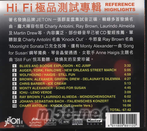 Hi Fi極品測試專輯試音必備大碟(m58.net) 著名發(fā)燒品牌JET ON一張群星云集試音正碟,專輯多首發(fā)燒名曲,龐大陣容CHARLY ANTOLINI,RAY BROWN,LAURINDO ALMEIDA及MARTIN DREW等,內(nèi)容廣泛,部分錄音早已被CD圣經(jīng)推薦,單聽鼓皇CHARLY ANTOLINI名曲‘KNOCK OUT’,牛筋皇RAY BROWN名曲‘MOOLIGHT SONATA’已完全投擇,還有MONTY ALEXANDER一財‘SONG FOR SUSAN’鋼琴獨奏,琴音晶瑩通透,女歌手ANNE HAIGIS 主題名曲‘STILL FUN’悅耳動聽,發(fā)燒友的至愛珍藏。