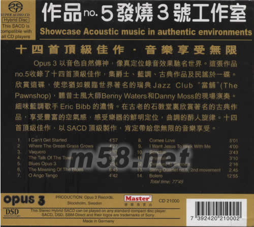 TEST CD 5 作品NO.5 SHOWCASE(瑞典OPUS 3 發燒工作室) SACD(m58.net) 發燒3號工作室 十四首頂級發燒極品 爵士、藍調、古典共冶一爐 大師示范經典作品 瑞典制造 OPUS 3以音色自然傳神,像真定位錄音效果馳名世界。這張作品NO 5收錄了十四首頂級佳作,集爵士、藍調、古典作品及民謠于一碟。欣賞這碟,使您猶如親臨世界著名的瑞典JAZZ CLUB“當鋪”(THE PAWNSHOP—),聽昔士風大師BENNY WATERS 和DANNY MOSS 的現揚演奏。細味藍調歌手ERIC BIBB的濃情。在古老的石教堂,欣賞著名的古典作品,享受豐富的空氣感,感受樂器的鮮明定位,曲調的醉人旋律。十四首頂級佳作,以SACDS頂級制作,肯定帶給您無限的音樂享受。