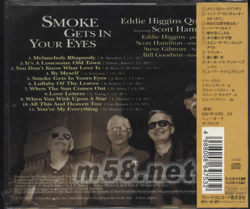 迷人爵士(m58.net) SMOKE GETS IN YOUR EYES ─ EDDIE HIGGINS QUARTET featuaring SCOTT HAMILTON 迷人爵士 爵士鋼琴大師 Eddie Higgins 演繹了十一首深情爵士名曲,并請來了特別嘉賓 Scott Hamilton 助陣。兩位大師一吹一彈,像談情說愛般動人。主題曲 "Smoke Gets In Your Eyes" 昔士風響起了我們熟悉的旋律,把整個聆聽環境升華至醉人境界,將無限的暖意送給樂迷。日本著名發燒品版 Venus 以24bit Hyper Magnum Sound 錄制,無限的通透感與一流的定位,怎能錯過!