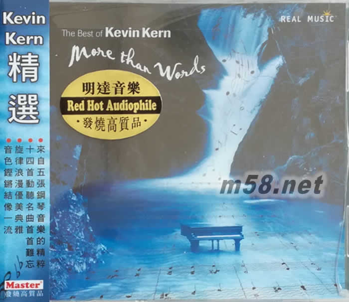 Kevin Kern 精選MORE THAN WORDS 新世紀純音樂(m58.net) “KEVIN KERN精選”是來自“綠色花園”創作演奏者,鼎鼎大名鋼琴大師KEVIN KERN從歷年最暢銷的五張大碟其中的13首經典名作,再加一首新作“CHILDREN AT PLAY”,結集而成的天碟 正如一眾樂評人說:[KEVIN KERN的琴音是如此優美、平易、浪漫、舒泰、而富感性;盡管曲終,琴音仍繞縈于腦海,真透心扉]。 這張KEVIN KERN精選包含了KEVIN KERN的最動聽鋼琴曲子,感情真摯,美妙清晰的琴音,不溫不燥,俊美得叫人如沐春風,加上美國新紀元天碟名廣REAL MUSIC的完美無瑕綠制,肯定使人愛不釋手。 來自五張鋼琴音樂的精粹 十四首動聽名曲首首難忘 旋律浪漫優美典雅 音色鏗鏘結像一流