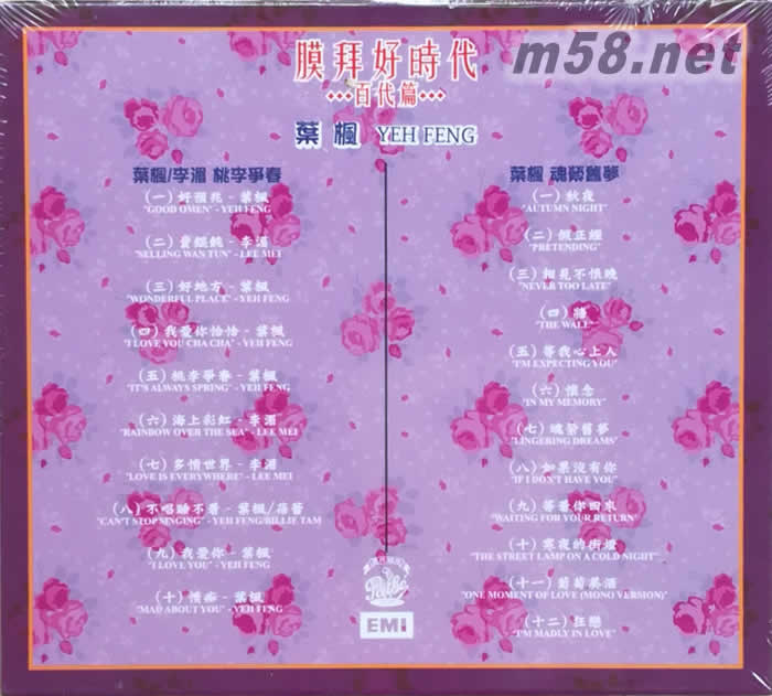 葉楓 桃李爭春 / 魂牽舊夢 [膜拜好時代之百代篇](m58.net) 清百代正版 品味架勢經典:《膜拜好時代》 眷戀的時代 醉人的音色 神話級偶像 EMI國語時代曲光輝重生 第二回 所有「膜拜好時代」2 in 1 CDset各附2張獨立專輯,內容完全獨立,各專輯小冊子20頁(或以上),刊有原錄音詳細資料、歌詞,部份更有當時代不同版本及設計的封面。全新文案特邀音樂評論人---Muzikland撰文,每碟不同,內容詳盡專精。