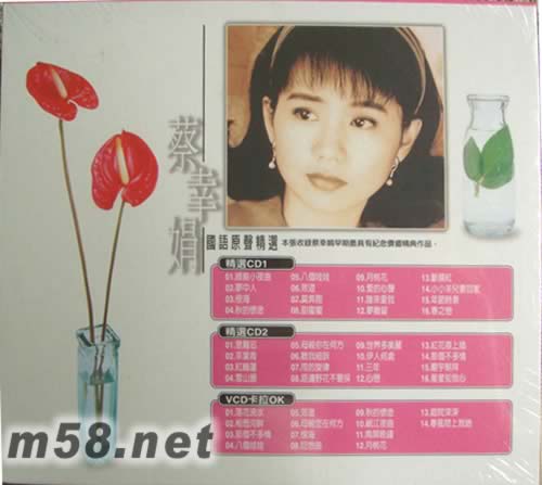 CD 1 1、綠島小夜曲 2、夢中人 3、恨海 4、秋的懷念 5、八個娃娃 6、效道 7、莫奔跑 8、甜蜜蜜 9、月桃花 10、愛的心聲 11、誰來愛我 12、夢難留 13、斷腸紅 14、小小羊兒要回家 15、年節時候 16、春之戀 CD 2 1、意難忘 2、茶葉青 3、紅睡蓮 4、雪山盟 5、母親你在何方 6、聽我細訴 7、雨的旋律 8、路邊野花不要采 9、世界多美麗 10、伊人何處 11、三年 12、心戀 13、紅花襟上插 14、那個不多情 15、廟宇朝拜 16、星星知我心 VCD卡拉OK 1、落花流水 2、相思河畔 3、那個不多情 4、八個娃娃 5、效道 6、母親你在何方 7、恨海 8、回想曲 9、秋的懷念 10、岷江夜曲 11、南屏晚鐘 12、月桃花 13、庭院深深 14、春風吻上我臉