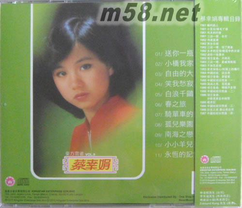 送你一瓶香水(限量原裝進口版)(m58.net) 蔡幸娟告別童真年代,邁向青春飛揚的代表作 從稚嫩與東洋曲風,轉為少女與現代風格 清新脫俗的民歌唱法,優美和諧的同人兩部重唱 傾訴荳蔻之齡內心深藏的款款情韻 燕語呢喃的歌聲令人如癡如醉 也帶她飛向更高更遠的未來!