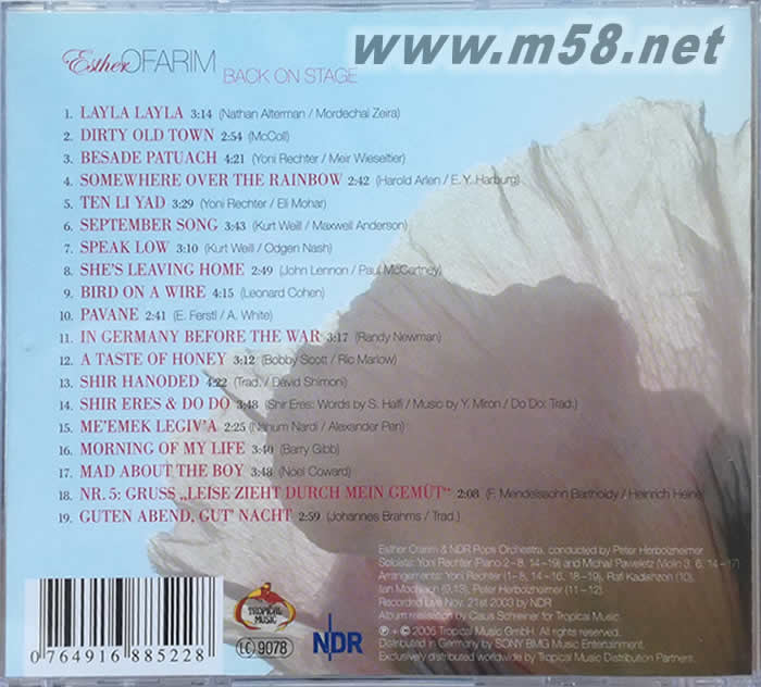 BACK ON STAGE 回到舞臺(m58.net) 2005年演唱會現場錄音 回到舞臺 繼經典發燒女CD<猶太妹>之后,ESTHER的另一張CD隆重推出,是ESTHER宣布停唱十年后的第一張作品,輯錄了合共19首歌曲之多,由<老虎魚>的混音公司pauler acoustics編輯及重新混音,人聲與錄音的完美結合,重新展現其發燒女聲的風范。