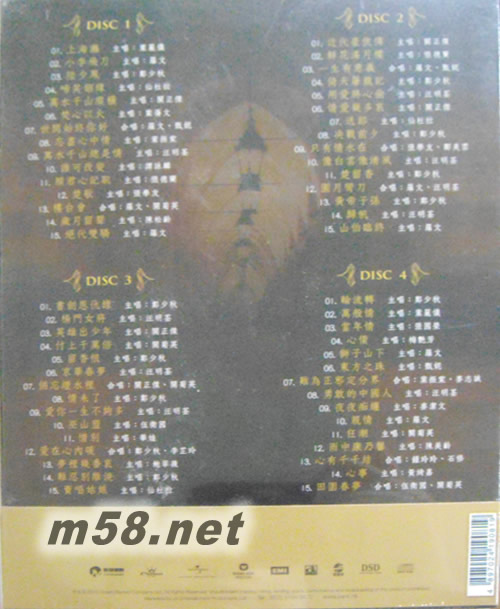 CD 1 01. 上海灘 主唱: 葉麗儀 02. 小李飛刀 主唱: 羅文 03. 陸少鳳 主唱: 鄭少秋 04. 啼笑姻緣 主唱: 仙杜拉 05. 萬水千山縱橫 主唱: 關正杰 06. 焚心以火 主唱: 葉蒨文 07. 世間始終你好 合唱: 羅文, 甄妮 08. 忘盡心中情 主唱: 葉振棠 09. 萬水千山總是情 主唱: 汪明荃 10. 誰可改變 主唱: 譚詠麟 11. 愿君心記取 主唱: 張德籣 12. 楚歌 主唱: 張學友 13. 樓臺會 合唱: 羅文, 關菊英 14. 歲月留聲 主唱: 陳松齡 15. 絕代雙驕 主唱: 羅文 CD 2 01. 近代豪俠傳 主唱: 關正杰 02. 鮮花滿月樓 主唱: 張德籣 03. 一生有意義 合唱: 羅文, 甄妮 04. 倚天屠龍記 主唱: 鄭少秋 05. 用愛將心偷 主唱: 汪明荃 06. 情愛幾多哀 主唱: 關正杰 07. 送郎 主唱: 仙杜拉 08. 決戰前夕 主唱: 鄭少秋 09. 只有情永在 合唱: 張學友,鄺美云 10. 像白云像清風 主唱: 汪明荃 11. 楚留香 主唱: 鄭少秋 12. 圓月彎刀 合唱: 羅文, 汪明荃 13. 黃帝子孫 主唱: 鄭少秋 14. 歸帆 主唱: 汪明荃 15. 山伯臨終 主唱: 羅文 CD 3 01. 書劍恩仇錄 主唱: 鄭少秋 02. 楊門女將 主唱: 汪明荃 03, 英雄出少年 主唱: 關正杰 04. 付上千萬倍 主唱: 關菊英 05. 留香恨 主唱: 鄭少秋 06. 京華春夢 主唱: 汪明荃 07. 倆忘煙水里 合唱: 關正杰, 關菊英 08. 情未了 主唱: 鄭少秋 09. 愛你一生不夠多 主唱: 汪明荃 10. 巫山盟 主唱: 伍衛國 11. 惜別 主唱: 華娃 12. 愛在心內暖 合唱:鄭少秋, 李芷玲 13. 夢里幾番哀 主唱: 鮑翠薇 14. 難忍別離淚 主唱: 鄭少秋 15. 賣唱姑娘 主唱: 仙杜拉 CD 4 01. 輪流轉 主唱: 鄭少秋 02. 萬般情 主唱: 葉麗儀 03. 當年情 主唱: 張國榮 04. 心債 主唱: 梅艷芳 05. 獅子山下 主唱: 羅文 06. 東方之珠 主唱: 甄妮 07. 難為正邪定分界 合唱: 葉振棠,麥志誠 08. 勇敢的中國人 主唱: 汪明荃 09. 夜夜癡纏 主唱: 麥潔文 10. 親情 主唱: 羅文 11. 狂潮 主唱: 關菊英 12. 雨中康乃馨 主唱: 陳美齡 13. 心有千千結 合唱: 鍾玲玲, 石修 14. 心事 主唱: 黃綺嘉 15. 田園春夢 合唱:伍衛國, 關菊英