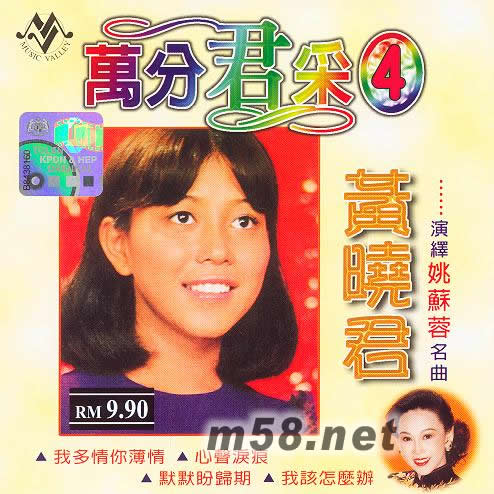 萬分君采4(m58.net) 姚蘇蓉有"淚盈歌后"之稱,那是因為她早期曾經以一首舊曲"秋水伊人",唱得淚聲齊下,令人感動之余而封了她這個稱號,她唱的歌曲都是以感情歌曲為主,表現得非常投入。黃曉君演繹姚蘇蓉的歌曲,聽起來的確很考功夫,有時候,一人最重要的是有自己的演唱風格,黃曉君的唱法是一個歌壇的異數,她強調的是自己的唱法,所以,無論她唱誰的歌曲都不會有原唱者的影子,像這張專輯里的"我多情你薄情","心聲淚痕","愛的路多么苦","我該怎么辦"等,這些稍為苦情的歌曲,黃曉君同樣的表現得很哀怨,唱輕快的歌曲,她的表現就很輕松呢!