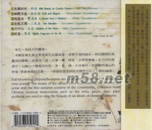 產品名稱:  秋菊(花樂4)(二胡,古箏,簫,琵琶、古琴)   [CD]