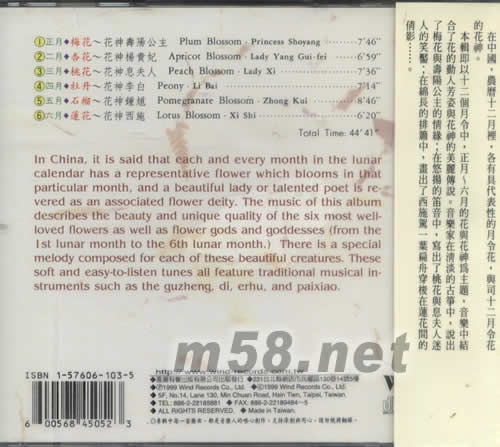 本輯即以十二個月令中,正月--六月的花與花神為主題,音樂中結合了花的動人芳姿與花神的美麗傳說。音樂家在清淡的古箏中,說出了梅花與壽陽公主的情緣;在悠揚的笛音中,寫出了桃花與息夫人迷人的笑面;在綿長的排簫中,畫出了西施駕一葉扁舟穿梭在蓮花間的倩影......