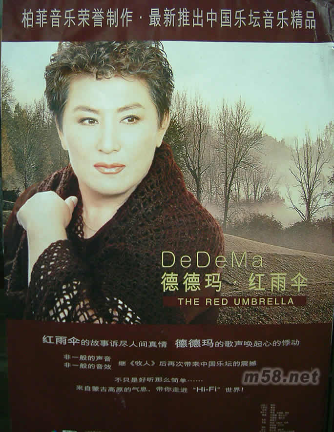CD: 1. 蒼天般的阿拉善 2. 蘇麗珂(格魯吉亞歌曲) 3. 紅雨傘 4. 草原的路 5. 草原夜色美 6. 我和草原有個約定 7. 美麗的草原我的家 8. 代欽塔拉草原 9. 初戀是一場冬夜里的雪 10. 前郭爾羅斯 11. 湖在歌唱 12. 致草原 13. 美麗的額濟納 14. 紅雨傘(天狼樂隊) VCD: 1. 紅雨傘
