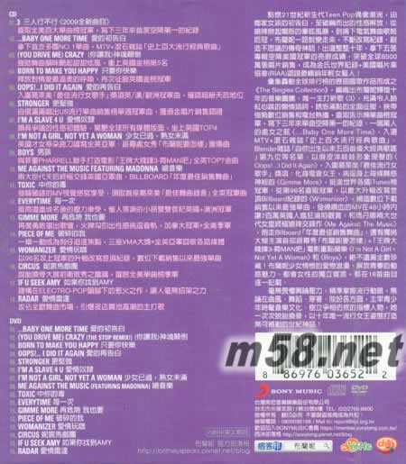 CD 1. 3 三人行不行〈全新曲目〉 直取全美百大單曲榜冠軍,寫下三年來首度空降第一的紀錄,風(fēng)光再創(chuàng)生涯高峰 2. ...Baby One More Time 愛的初告白 拿下首支多國NO.1單曲,入選MTV+滾石雜誌「史上百大流行經(jīng)典歌曲」名單 3.(You Drive Me) Crazy (你讓我)神魂顛倒 強勁舞曲韻味颳起甜甜炫風(fēng),衝上英國金榜第5名,西班牙、比利時相繼摘冠 4. Born To Make You Happy 只要你快樂 釋放對情愛最溫柔的呼喚,感人至深的再次征服英國金榜+愛爾蘭流行榜 5. Oops!...I Did It Again 愛的再告白 入圍葛萊美「最佳流行女歌手」獎項,奠定下一位舉世矚目的國際巨星之關(guān)鍵 6. Stronger 更堅強 更為自信滿滿的唱出US流行單曲銷售榜單週冠軍曲,獲頒金唱片銷售認證 7. I'm a Slave 4 U 愛情奴隸 頗具爭議的性感初體驗,驚艷全球的搶足媒體所有版面與鋒頭,坐上英國Top4 8. I'm Not A Girl,Not Yet A Woman 少女已過,熟女未滿 英國才女蒂朵跨刀譜寫,首部螢?zāi)惶幣恪覆继m妮要怎樣Crossroads」宣傳曲 9. Boys 男孩 與全方位鬼才菲董Pharrell替電影「王牌大賤諜3-夠MAN吧」再掀話題 10. Me Against The Music featuring Madonna 嗆音樂 兩大世代天后過癮十足的終極交鋒,抱走Billboard「年度最佳銷售舞曲」加冕 11. Toxic 中你的毒 發(fā)騷破錶的MV視覺感官享受,領(lǐng)取第一座葛萊美「最佳舞曲錄音」獎項肯定 12. Everytime 每一次 風(fēng)雨道盡布蘭妮成名后的壓力承受,催人落淚的小品雙雙登記英國+澳洲冠軍 13. Gimme More 再危險 我也要 再度勇敢復(fù)出歌壇,通上強力高壓電氣頻率,熱辣辣的勾引出性感挑逗音軌 14. Piece Of Me 破碎的我 一舉一動都成為狗仔追逐焦點,藉此曲回敬那些曾大肆報導(dǎo)她的媒體工作人員 15. Womanizer 愛情玩咖 以96名攻上冠軍的升幅改寫登頂告示牌歷史紀錄,數(shù)位下載銷售以來最強單曲 16. Circus 妮裳馬戲團 充滿更跳的節(jié)拍、更來電的順暢音線,脫胎換骨的大展前衛(wèi)敢秀之膽識 17. If U Seek Amy 如果你找到Amy 建構(gòu)在Electro-Pop韻腳下的惹火之作,讓人毫無招架之力的隨樂起舞擺動 18. Radar 愛情雷達 吸取飽滿的電子養(yǎng)分,攻佔全歐舞曲市場,同時引發(fā)夜店舞池高潮的主打歌 1 3 三人行不行 2 ...Baby One More Time 愛的初告白 3 (You Drive Me) Crazy (你讓我)神魂顛倒 4 Born to Make You Happy 只要你快樂 5 Oops!...I Did It Again 愛的再告白 6 Stronger 更堅強 7 I'm a Slave 4 U 愛情奴隸 8 I'm Not a Girl, Not Yet a Woman 少女已過,熟女未滿 9 Boys 男孩 10 Me Against the Music featuring Madonna 嗆音樂 11 Toxic 中你的毒 12 Everytime 每一次 13 Gimme More 再危險 我也要 14 Piece of Me 破碎的我 15 Womanizer 愛情玩咖 16 Circus 妮裳馬戲團 17 If U Seek Amy 如果你找到Amy 18 Radar 愛情雷達 1 ...Baby One More Time 愛的初告白 DVD 2 (You Drive Me) Crazy (The Stop Remix!) (你讓我)神魂顛倒 DVD 3 Born to Make You Happy 只要你快樂 DVD 4 Oops!... I Did It Again 愛的再告白 DVD 5 Stronger 更堅強 DVD 6 I'm a Slave 4 U 愛情奴隸 DVD 7 I'm Not a Girl, Not Yet a Woman 少女已過,熟女未滿 DVD 8 Me Against the Music (featuring Madonna) 嗆音樂 DVD 9 Toxic 中你的毒 DVD 1 Everytime 每一次 DVD 11 Gimme More 再危險 我也要 DVD 12 Piece of Me 破碎的我 DVD 13 Womanizer 愛情玩咖 DVD 14 Circus 妮裳馬戲團 DVD 15 If U Seek Amy 如果你找到Amy DVD 16 Radar 愛情雷達 DVD 《內(nèi)附中英文歌詞》