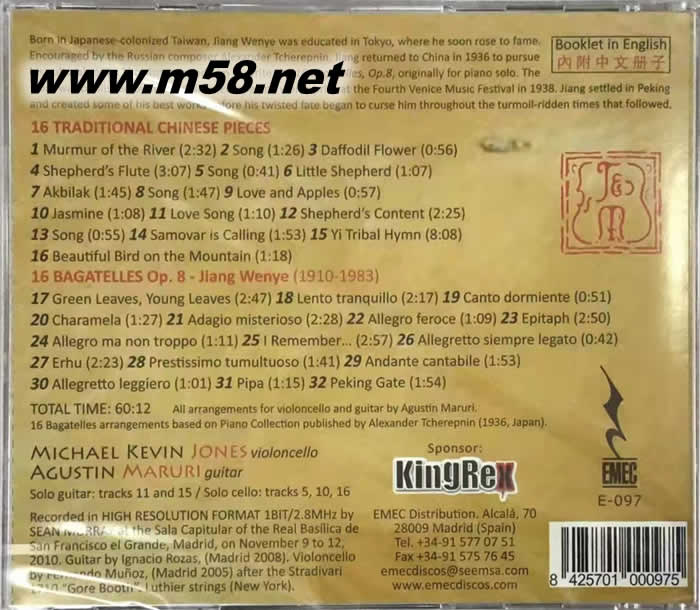 HIFI 中國民謠(吉它、大提琴)江文也斷章小品(m58.net) AGUSTIN MARURI 吉它 MICHAEL KEVIN JONES 大提琴 暢銷組合西班牙吉他巨星Agustin Maruri ,伙拍大提琴名家 Michael Kevin Jones 以二重奏演繹多首中國民謠,茉莉花,康定情歌等及中國近代音樂大師江文也的多首斷章小品,悅耳動人,高分晰力錄音音色靚絕。 第一首《青葉若葉》:原譜鋼琴曲是普羅科菲耶夫風格的東方觸技曲。 第二首:以無調性的現代手法,表現出孤寂的意境,與第一首一樣,此曲原本屬于《五月組曲》,標題《燈下》。 第三首:以五聲音階寫成的二部創意曲,是東方色彩的對位法。 第四首《賣糖小販的金蘆笛》:淡淡的拉威爾色彩,原曲的演奏提示:表情悉隨尊意,可以隨意重復,臨時停止。江文也改編為《故都素描》第一樂章《嗩吶-街上情景》,表情生動。 第五首:五聲音階加上德布西的印象派風格。 第六首:敲擊和弦令人聯想起巴托克,原始狂野的民族風格又近似史特拉文斯基。 第七首《墓碑銘-寄于弟》:懷念亡弟文光,模仿中國古琴的琵音,和弦創新,再以單音勾起愁緒。 第八首:另一段普羅科菲耶夫風格的東方觸技曲。 第九首《難忘的》:五聲音階與印象派色彩交迭,緬懷過去的古琴曲。 第十首:五聲音階民謠風格加上二部創意曲,譜出一片江南初春的景致。 第十一首《午后的胡琴》:幽怨感人的旋律,江文也改編為《故都素描》第三樂章《在廢墟》,并多次出現于管弦樂組曲,作為連貫樂章之間的主題動機,像莫索斯基的《展覽會圖畫》。 第十二首:《故都素描》的第二樂章《劇場氣氛》,技巧上雖然可以說是巴托克式,但全曲氣氛絕對是傳統京劇的急管繁弦、大鑼大鼓。 第十三首:民謠風、鄉土情。 第十四首:《故都素描》的第四樂章《牧童與垂柳》,民謠風的二部創意曲。 第十五首《午夜的琵琶》:敲擊跳音模仿琵琶的清越音色。 第十六首《北京正陽門》:鋼琴獨奏左手只是單音,已經帶出滄桑的歷史氣魄,江文也改編《故都素描》終章,雄偉力度直比《展覽會圖畫》終章《基輔大門》。