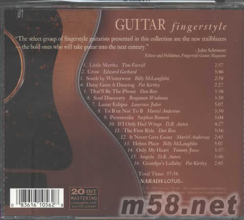 價格為估,以實到貨為準! (吉它)指法發燒天碟GUITAR FINGERSTYLE(m58.net) 請點看產品正、背面大圖 德國制造 20比特 11位木吉他手技術性彈奏,音色清純自然,闊度與空間感一流。SHOW QUALI之作 “TE SELECT GROUP OF FINGERSTYLE GUITARISTS PRESENTED IN THIS COLLECTION ARE THE NEW TRAILBLAZERS ——THE BOLD ONES WHO WILL TAKE GUITAR INTO THE NEST CENTURY。” ——JOHN SCHROETER EDITOR AND PUBLISHER,FINGERSTYLE GUITAR MAGAZINE