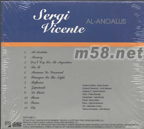 1、AL-ANDALUS 2、MEMORY 3、DON’T LRY FOR ME ARGENTINA 4、GIN FI 5、MANANA DE LARNAVAL 6、GGLIANGERS FN THE NIGHT 7、REFLEXION 8、ZAPATEADO 9、DE FIESTA 10、FLERIA 11、GUENO 12、OLA GUITARRA SOLISTA:SERGI VICENTE GUITARRA FLAMENCA :JORDI ALBARRAN GUITARRA 2 DAVID HERRANZ VOILIN PEDRO BURZALO VIOLONCHELO JALIA BORRAS FLAUTE :ELENA NIETO PIANO OLGA KHARITONINA VOZ:MERCEDES CORTES TECNICO DE SONIDO :JORDI MUNOZ