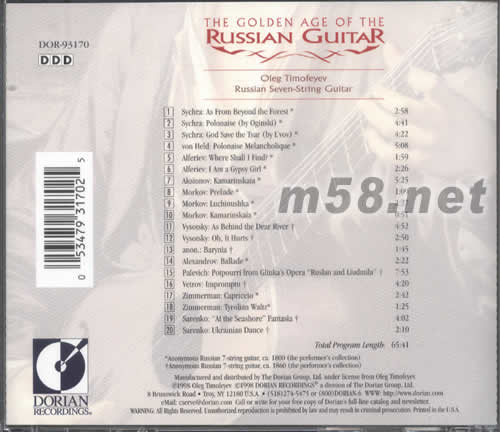 1、SYCHRA:AS FROM BEYOND THE FOREST 2、SYCHRA:POLONAISE 3、SYCHRA:GOD SAVE THE TSAR 4、VON HELD :POLONAISE MELANCHOLIQUE 5、ALFERIEV:WHERE SHALL I FIND 6、ALFERIEV:I AM A GYPSY GIRL 7、AKSIONOV:KAMRINSKAIA 8、MORKOV:LUCHINUSHKA 10、MORKOV:KAMARINSKAIA 11、VYSOTSKY:AS BEHIND THE DEAR REIVER 12、VYSOTSKY:IT HURTS 13、ANON:BARYNIA 14、ALEXANDROV:BALLADE 15、PALEVICH:POTPOURRI FROM GLINKAS OPERA RUSLAN AND LIUDMILA 16、VITROV:IMPROMPTU 17、ZIMMERMAN:CAPRICCIO 18、ZIMMERMAN:TYROLIAN WATZ 19、SARENKO:AT THE SEASHORE PANTASIA 20、SARENKO:UKRAINIAN DANCE