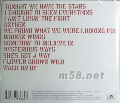 01. tonight we have the stars 02. i thought i'd seen everything 03. i ain't losin' the fight 04. oxygen 05. we found what we were looking for 06. broken wings 07. somethin' to believe in 08. mysterious ways 09. she's got a way 10. flower grown wild 11. walk on by