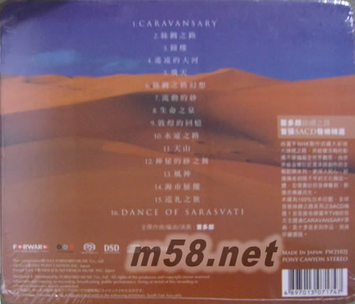 1. CARAVANSARY 4:51 2. 絲綢之路 4:07 3. 鐘樓 2:21 4. 遙遠(yuǎn)的大河 2:37 5. 飛天 4:29 6. 絲綢之路幻想 3:24 7. 流動(dòng)的砂 2:58 8. 生命之泉 3:53 9. 敦煌的回憶 3:20 10. 永遠(yuǎn)之路 3:46 11. 天山 2:24 12. 神秘的砂之舞 5:38 13. 風(fēng)神 4:21 14. 海市蜃樓 3:41 15. 巡禮之旅 3:50 16. DANCE OF SARASVATI 6:34