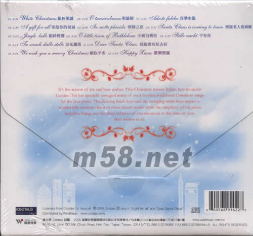 01 銀色圣誕(White Christmas) 02 圣誕樹(O tannenbaum) 03 真摯來臨(Adeste fideles) 04 寄給你的祝福(A gift for all) 05 寧靜之夜(In notte placida) 06 圣誕老人進城啰 (Santa Claus is coming to town) 07 銀鈴輕響(Jingle Bell) 08 小城伯利恒 (O little town of Bethlehem) 09 平安夜(Stille nacht) 10 星光灑落(Tu scendi dalle stelle) 11 我親愛的尼古拉(Dear Santa Claus) 12 愿你平安 (We wish you a merry Christmas) 13 歡樂圣誕(Happy Xmas)