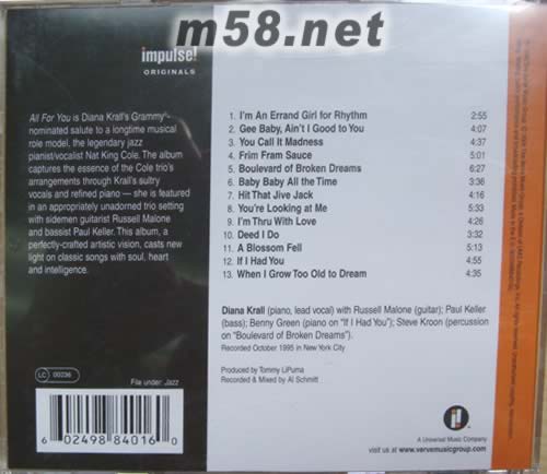 ALL FOR YOU(m58.net) 美國音樂史上有兩位元Nat King Cole,大多數(shù)的人只記得歌聲優(yōu)美,唱過「Unforgettable」等無數(shù)名曲的那一位,而被遺忘的那位Nat Cole,則是爵士史上數(shù)一數(shù)二頂尖鋼琴師之一,流利的鋼琴線條為他贏得了許多的仰慕者,包括Oscar Peterson及Bill Evans等大師。這兩位Nat Cole后來與吉他手Oscan Moore及貝斯手Johnny Miller組成了King Cole Trio,在40年代發(fā)表了「All For You」、「Staighten Up And Fly Right」等曠世鉅作。 「All For You」這張專輯是一位叫叫Diana Karll的女孩向King Cole Trio致敬的一張專輯,也是一張受Nat Cole啟發(fā)而孕育而生的作品,Diana一人分飾Nat Cole爵士歌手與爵士歌手Nat Cole兩個角色,并找來吉他手Rusell Malone和貝斯手Paul Keller,仿照King Cole Trio同演出,他們倆人去年花了一整個夏天作巡迴演出,已在長達數(shù)月的合作中培養(yǎng)出絕佳的默契。和King Cole Trio一樣,Diana Krall的樂團,這是一個沒有鼓手的樂團,正因如此他們必須使勁地演奏以代替鼓手在樂團中主導(dǎo)節(jié)奏的地位。Diana Krall歌聲的感覺,就像凌晨一、兩點,獨自一人坐在人潮已退的小酒吧裏聽歌一樣,在一天疲憊之后,似乎只有她略帶傷感的歌聲最瞭解你的心情。而她的嗓音就像是加了蜂密的威士卡,一醉卻令人無法抗拒。專輯中的第一首曲子”I’m An Errand Girl For Rhythm”被Diana唱得十分俏皮,中間一段鋼琴SOLO非常精彩。”Gee Baby,Ain’t I Good To You”原為King Cole Trio的作品,Diana將原本的版本放慢速度,別有一番風(fēng)味。一旦品嚐她的作品,相信你也會像喝了加上蜂蜜的威士卡一樣,明之易醉,卻忍不住想喝。 Diana Krall的嗓音至此已經(jīng)到達隨心所欲,動靜皆美的境界,而琴藝更是Ragtime,Swing, Bop, Blues各式風(fēng)格盡出,而且觸鍵輕盈,配速熟練,已成一代高手之姿。請聽曲目⑴Nat King Cole的原創(chuàng)曲“I'm An Errand Girl For Rythm”,大堆頭和絃,巧妙的急速搖擺中,我們聽到吉他和鋼琴精彩非凡的飆奏,曲⑶是Cole最愛的情歌“You Call It Madness”,Diana Krall以外表沉穩(wěn),實則以熱情的嗓音,賦予原曲冷豔的面貌;曲⑸“Boulevard Of Broken Dreams”首次聽得Marianne Faithful滄桑冷酷的版本如今給了我一絲溫暖浪漫的感受。Diana Krall將之獻給James Dean。其他“Hit That Jive Jack”Russell Malone亦加入聲部合唱,活潑的節(jié)奏,令人聞之搖擺,“If I Had You”一曲,Benny Green的伴奏讓Diana Krall有完全的空間,全心展露歌藝,為這張專輯創(chuàng)下完美的句號。