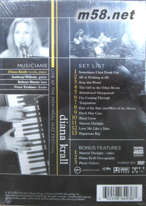 價格為估,以實到貨為準! Live at the Montreal Jazz Festival 蒙特利爾爵士節25周年現場音樂會 DVD(m58.net) 戴安娜登峰造極的演出 Rating: Not Rated Rating Reason: n/a Runtime: DVD Code: Region 1 US, CA Genre: Musical & Performing Arts Color: Color