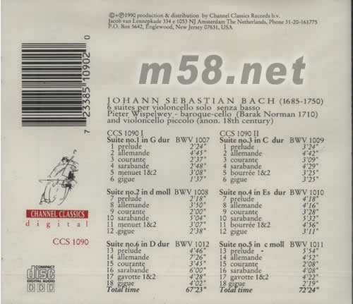 CCDS 1090 I Suite nr.1 in G dur BWV 1007 1、Prelude 2、allemande 3、courante 4、sarabande 5、menuer1&2 6、gigue Suite nr.1 in G dur BWV 1008 7、prelude 8、allemande 9、courante 10、sarabande 11、menuet 1&2 12、gigue Suite nr.1 in G dur BWV 1009 13、prelude 14、allemande 15、courante 16、sarabande 17、menuet 1&2 18、gigue CCS 1090 II Suite nr.1 in G dur BWV 1010 1、Prelude 2、allemande 3、courante 4、sarabande 5、menuer1&2 6、gigue Suite nr.1 in G dur BWV 1011 7、prelude 8、allemande 9、courante 10、sarabande 11、menuet 1&2 12、gigue Suite nr.1 in G dur BWV 1012 13、prelude 14、allemande 15、courante 16、sarabande 17、menuet 1&2 18、gigue