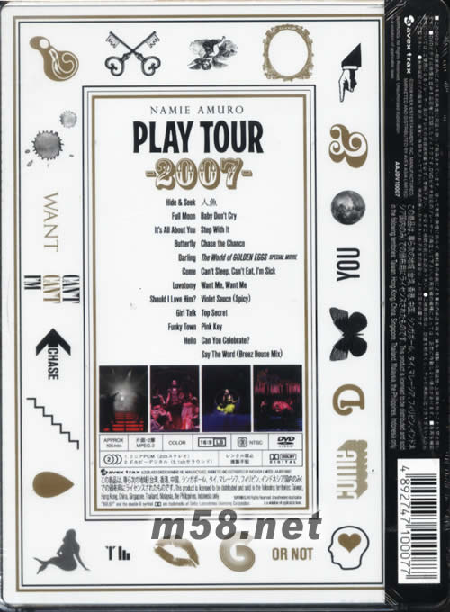 NAMIE AMURO PLAY TOUR 2007 DVD(香港版)(m58.net) 安室奈美惠演出最多場次全65回!縱貫日本全國的演唱會,東京公演完全收錄,不負「Hip -pop女王」之名! 以Album『PLAY』為主題的作品,是在去年Album release后收錄的全國TOUR的作品。 收錄『PLAY』之話題作GOLDEN EGGS, “AMUROchan”新型態亦可看到。