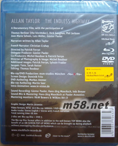 The Endless Highway 無盡的公路 藍光DVD(m58.net) BLU-RAY DISC +DVD2 SET 老虎魚首張紀錄影片,紀錄有完美唱作天皇之稱的ALLAN TAYLOR 的唱作生涯,與您分享他超過年游歷旅程,包括他的創作錄感的由來,寫作歌曲的過程,巡回演唱會的記錄片段,獨家披圳錄音室的錄音實況等,同時以藍光影碟和DVD 5制式捆梆式推出,使你可從中作一比較,哪個制式最接近你對完美的嚴格要求,同時更是收藏者必然的選擇。
